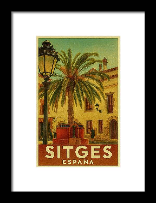 This vintage-style travel poster captures the charming Casa Rectoral in Sitges, Spain, nestled within a picturesque street scene. The artwork beautifully highlights the unique architecture of this historic building, surrounded by traditional Spanish elements, including a distinctive palm tree and a charming fountain. The color palette features warm Mediterranean tones, deep blues, and rustic oranges, evoking a sense of nostalgic warmth and timeless beauty. It’s an ideal piece for those who appreciate European charm, architectural history, or the classic appeal of vintage travel posters. A vintage poster depicting a street scene in Sitges, Spain. A palm tree and an old lamppost stand against a backdrop of traditional architecture.