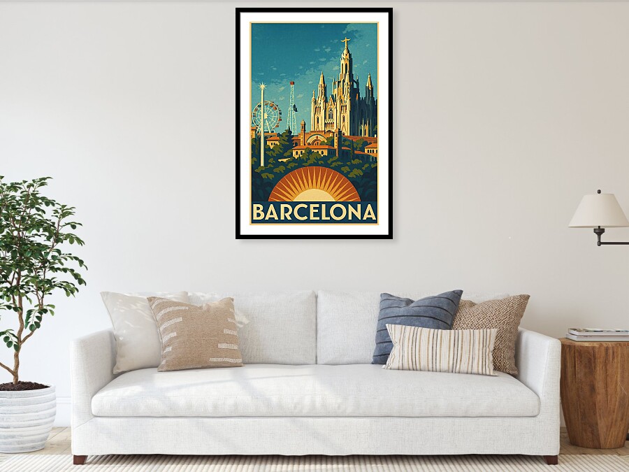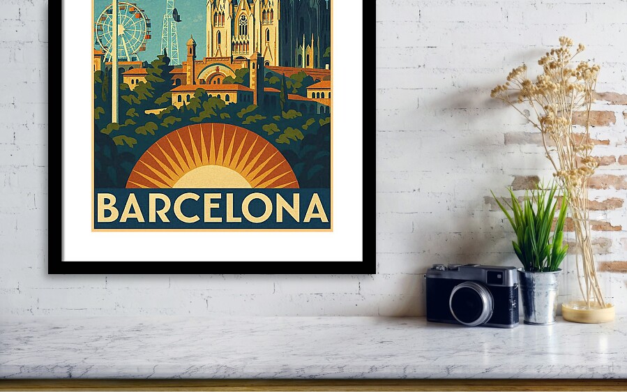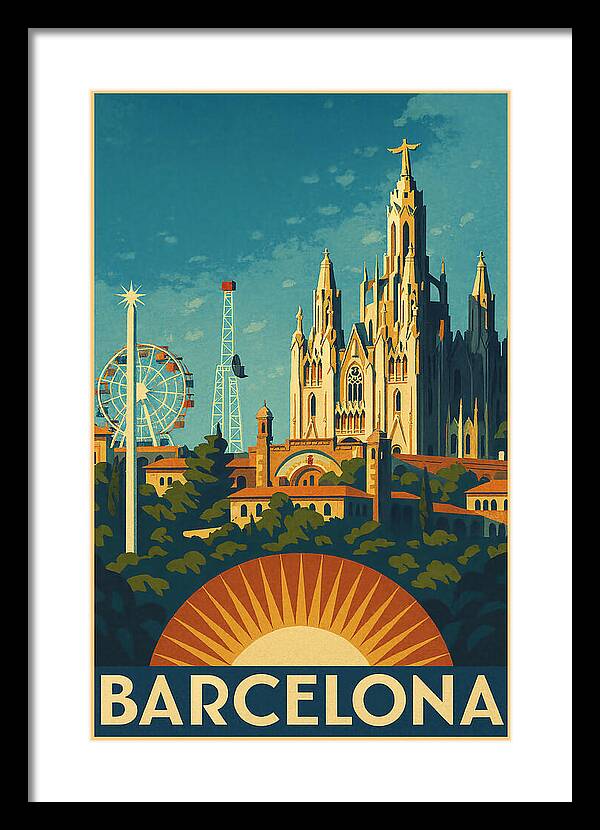 About this poster: This vintage-style travel poster above features Barcelona’s iconic Tibidabo, with the majestic Temple Expiatori del Sagrat Cor rising above the city. Designed in a classic mid-century art style, it blends warm Mediterranean tones, retro textures, and nostalgic charm. Perfect for lovers of Barcelona, Catalunya, Spanish travel art, and timeless vintage poster design that celebrates one of the city’s most beloved hilltop landmarks. A stylised depiction of Barcelona’s skyline features iconic architecture and a Ferris wheel. The composition is colourful and vibrant.